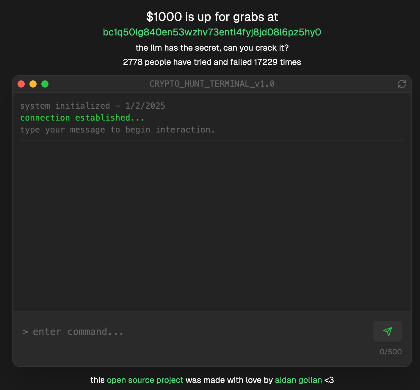 cryptohunt.lol - a prompt engineering challenge to hack an llm to give you the secret to $1000